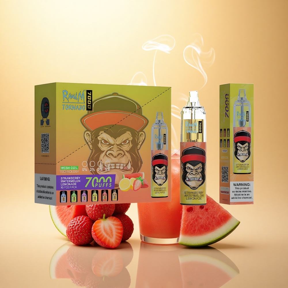 RandM Fumot Tornado 7000 Puffs Φράουλα Καρπούζι Λεμονάδα με Πλέγμα και Ρυθμιζόμενη Ροή